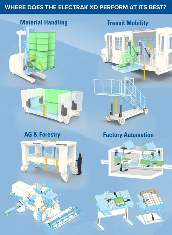 Har du något stort och tungt som behöver flyttas? Nu lanserar Thomson det kraftigaste standardställdonet någonsin med en lastkapacitet på 25.000 N i en smart förpackning. Thomson XD är ett nytt stort steg mot att ersätta komplicerade hydrauliska lösningar med elektromekanik med precision och smarta funktioner. XD är designat för moderna kontrollerbara applikationer och är samtidigt väldigt stryktåligt, med IP-klass IP67/69K och ett temperaturområde på -40 C till + 85 C. Med hastighet på upp till 75 mm/s, en duty cycle på upp till 100% och en livslängd upp till 275.000 cykler finns få gränser för vad man kan klara.